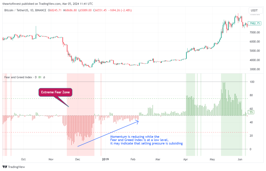 在下降趋势中:如果动量开始减弱,而恐惧与贪婪指数处于低位,可能表明卖出压力正在减弱,市场可能即将反转。