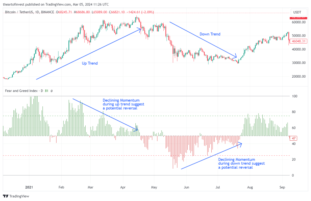在上升趋势中:如果动量开始下降,而恐惧与贪婪指数处于高位,可能表明买入动力减弱,上升趋势即将结束。